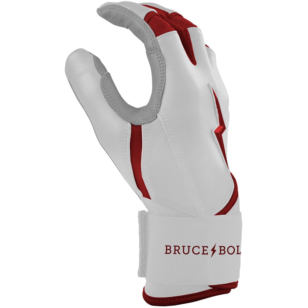 HIGHEST QUALITY, MOST DURABLE BATTING GLOVE IN BASEBALL: Each pair of BRUCE BOLT batting gloves are handmade by skilled craftsmen using only the highest quality 0.9mm Cabretta leather and stitching techniques which makes our gloves buttery soft but more durable than any other glove on the market.